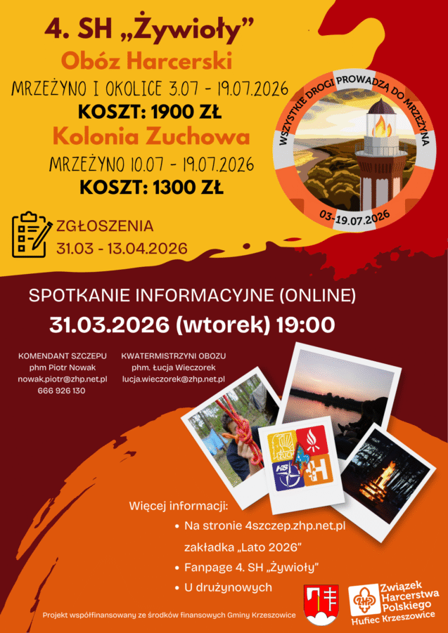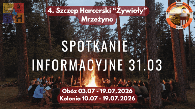Link do prezentacji ze spotkania: Prezentacja 31.03.2026 – spotkanie informacyjne SPOTKANIE INFORMACYJNE (ONLINE) 31.03.2026 19:00 SPOTKANIE INFORMACYJNE (ONLINE) Obóz Harcerski i Kolonia Zuchowa 4. SH „Żywioły” Mrzeżyno 03.07 – 19.07.2026 | Dołączanie do spotkania | Microsoft Teams Czuwaj!Zapraszam na spotkanie informacyjne dotyczące tegorocznego obozu 4. SH „Żywioły” któryodbędzie się w Mrzeżynie w dniach 03.07 – 19.07.2026.Na spotkaniu będziecie mogli Państwo dowiedzieć się więcej o: